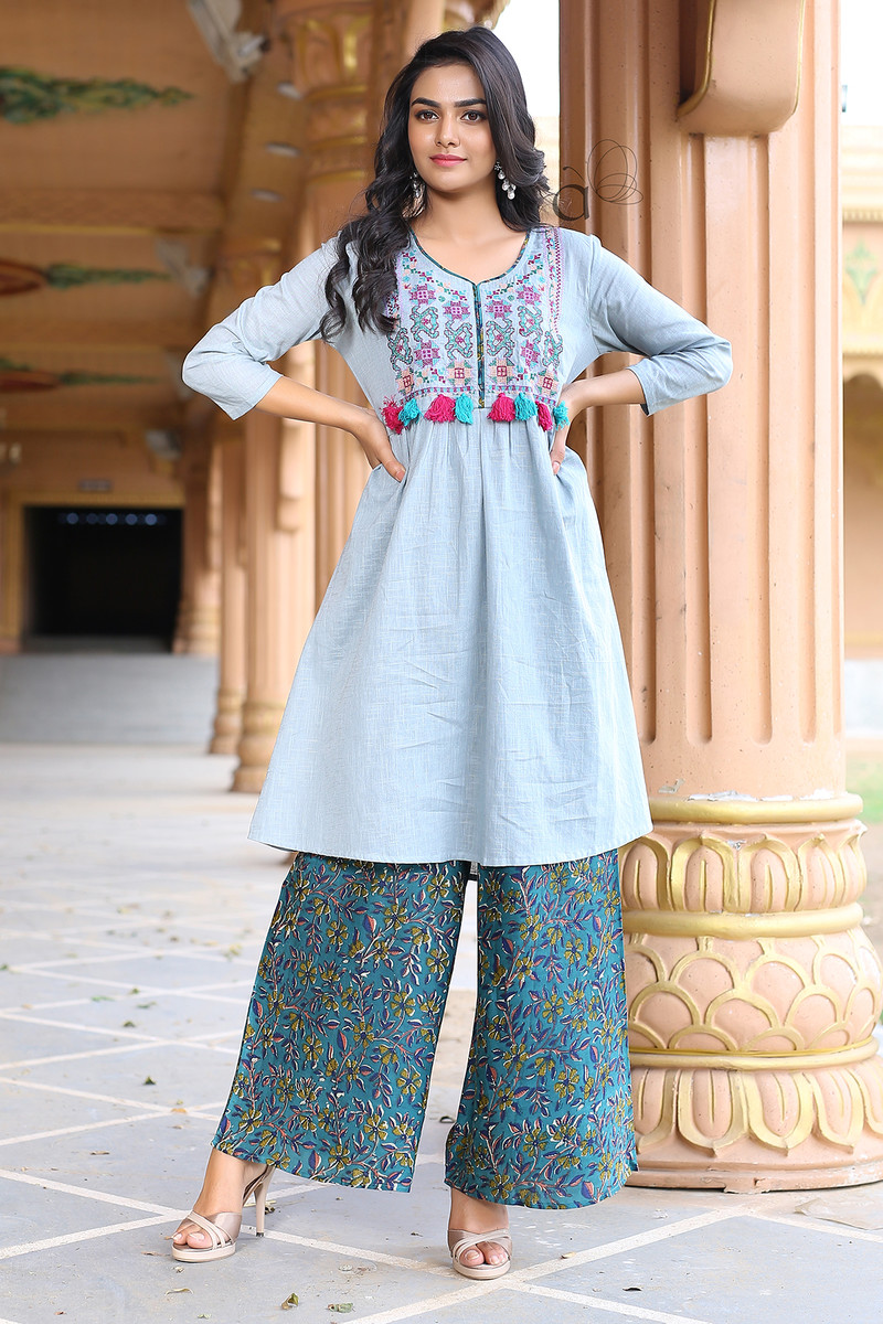 Cross Stitch, Embroidery, Gown Style Kurti With Rayon Printed Pants, Interlocking Stitching With Bottom Double Fold Stitching.(Palazzo Pants Flayer Lenght-32Inch)