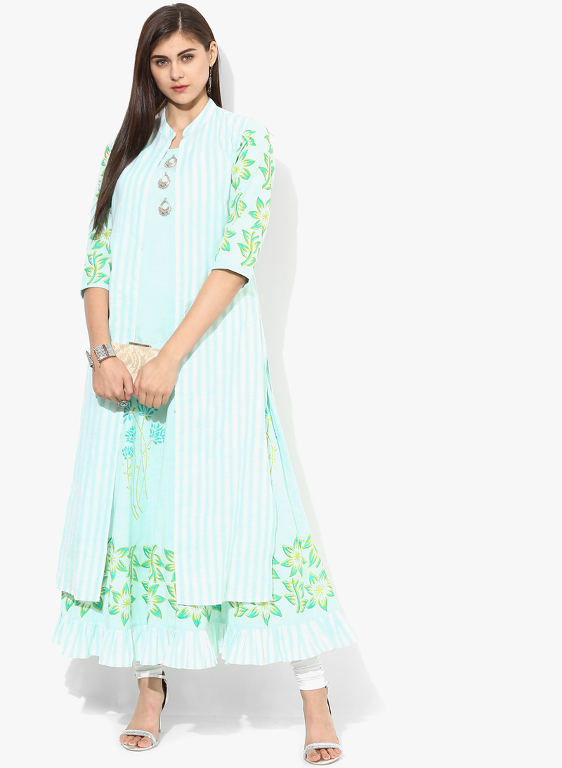 Light Green Cotton Yarn Dyed Slub Inner Block Printed With Green Yarn Dyed Katha Stripe Jacket Dress, Interlocking-Same Thread, Side Slit Protection Stitching